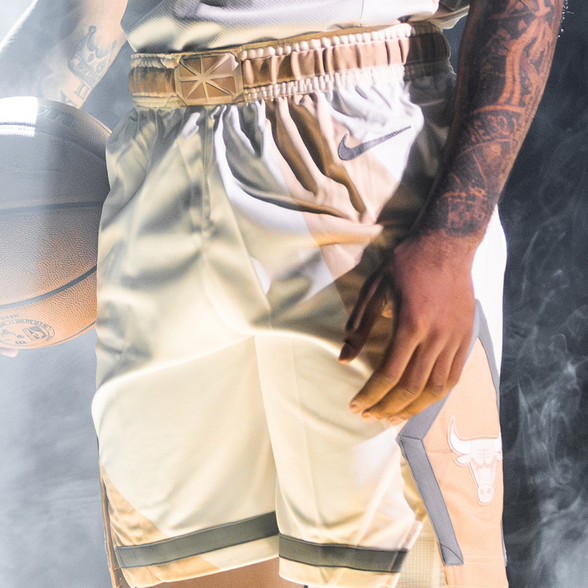 Two spotlights cross down the side of the jersey and shorts, paying homage to the famous Bulls starting lineup introductions at the United Center.